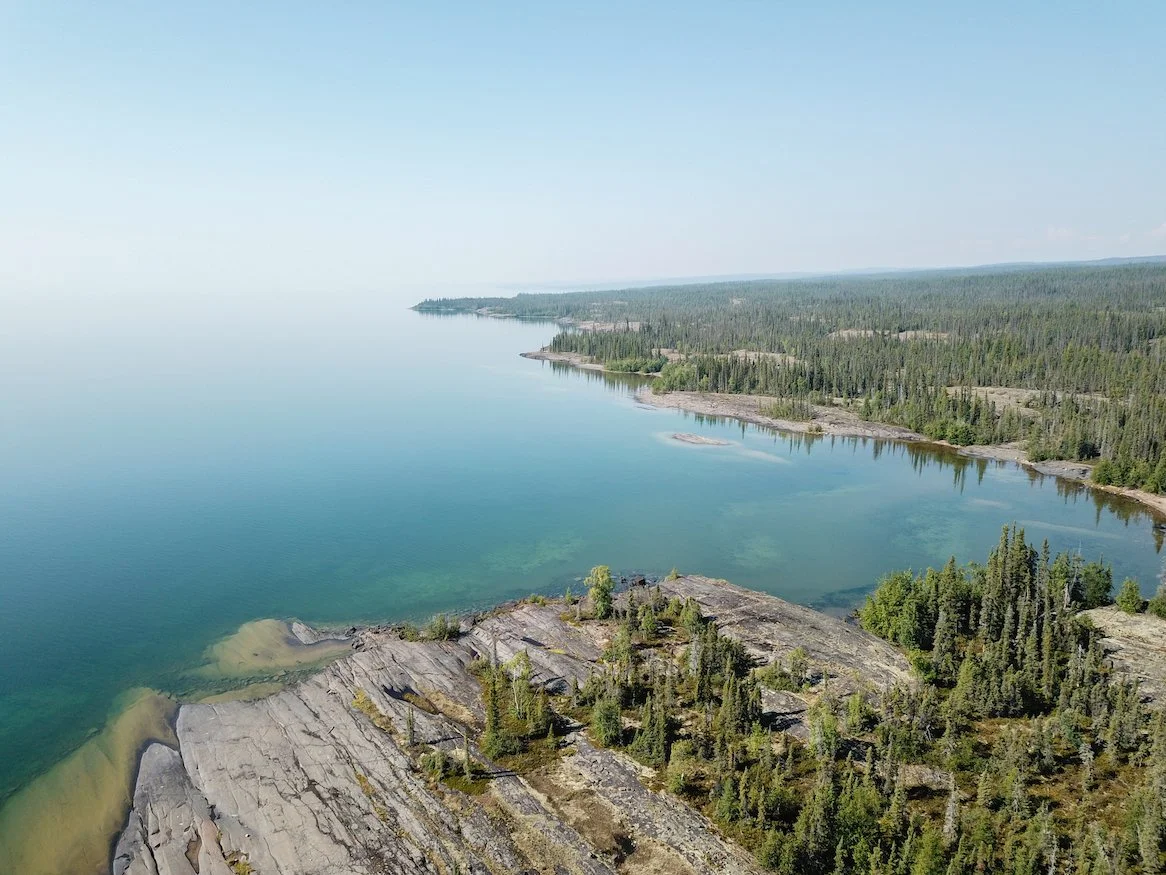 Day 1: Depart from the Government Dock in Yellowknife. Boat 2–3 hours to Burnt Island for tea, snacks, a short walk, and bathroom break. Continue east into the widening waters and enter the East Arm, passing the cliffs of Blanchett Island. Arrive at Talthelei Narrows and set up camp Dene-style with spruce poles and optional spruce-bough flooring. Enjoy a bush dinner and an evening by the fire with stories and the sound of loons across the water.